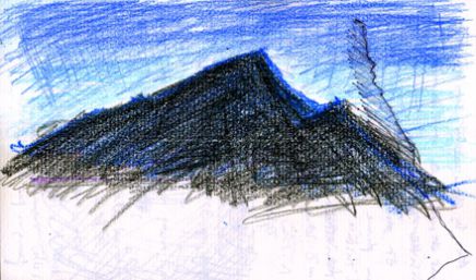 Au-dessus, comme un père autoritaire qu’on craindrait, les montagnes, immuables, veillent. Des bribes de brouillard se dessinent mais grosso modo on ne voit rien. On devine juste. Que la force est là-haut, que la menace vient des hauteurs, comme la protection.