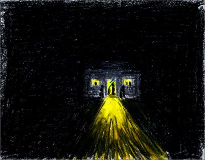 La route monte en lacets, il fait nuit, déjà en altitude, les lumières du lointain commencent à se voir. Sur cette petite route, nous ne croisons personne, nous tournons, les phares de la voiture éclairent uniquement le chemin, nous progressions à tâtons.
