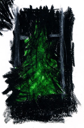 Dans le cossu immeuble de mon atelier j’entre. Dans le hall il y a un gros sapin qui clignote. C’est joli. Mais à peine ai-je passé la porte que le détecteur de mouvement me capte et la lumière se déclenche. Le spectacle lumineux du sapin tombe à l’eau.