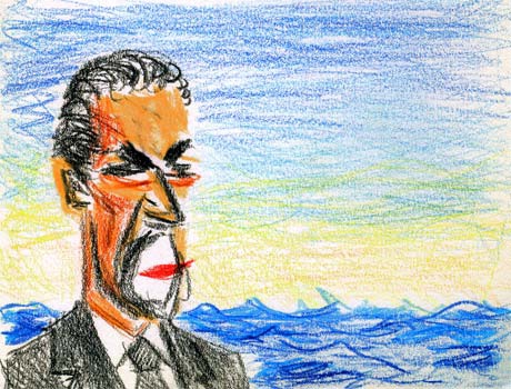 Après les mots, l’image. Mais où a-t-il été prendre cette photo d’océan calme (à l’heure où je tape ce texte on le sait, c’est en Grèce et elle a été achetée sur une banque d’images, aucun UMP n’a fait le déplacement sur une plage nationale pour prendre un cliché) ? Certainement encore sur le yatch d’un de ses amis, on lui avait pourtant dit au début de son quinquennat que ça passait mal. Et quelle idée a eu Franck Louvrier, son conseiller en communication, de lui soumettre l’idée de poser ainsi devant l’horizon ? Il lui manque une casquette de commandant et on obtient le DVD de "La Croisière s’amuse”. Pas un nuage, la traversée va être plaisante. N’entendez-vous pas la musique du générique à la vue de cette affiche ?