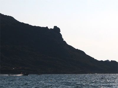 Sur la plage j'observe ce rocher, Pascale quand elle était petite trouvait qu'il ressemblait à Mickey de profil qui regarde la mer, allongé. Je trouve qu'elle a raison. Pascale voit souvent des bonhommes un peu partout. Quand on est parti en Crète elle me parlait avec évidence de la forme de bonhomme de l'île. C'est vrai, si on a un peu d'imagination et qu'on la regarde de côté, on peut y voir une tête... Pascale, elle, l'avait repérée depuis toujours, et je crois que ça lui faisait un petit quelque chose d'être là, ça l'amusait. Notre hôtel était donc juste avant la narine... mais heureusement nous n'avons pas entendu ronfler.